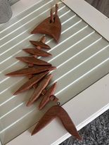 Fish skeleton for hanging or for coffee table decoration comes with wooden hook and string.